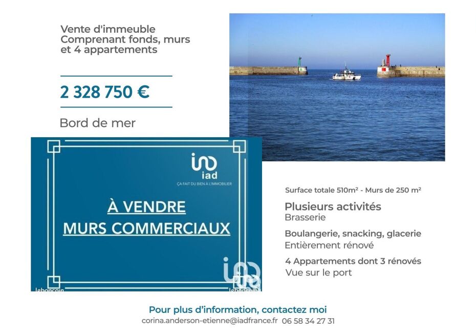 Iad France - Corina Anderson-Etienne (06 58 34 27 31) vous propose : À vendre – Immeuble à usage mixte (murs commerciaux + logements) Idéalement situé à deux pas du port de pêche et de la mer Cet immeuble offre un fort potentiel commercial et locatif grâce à plusieurs pôles d’activités déjà en place et un ensemble résidentiel...